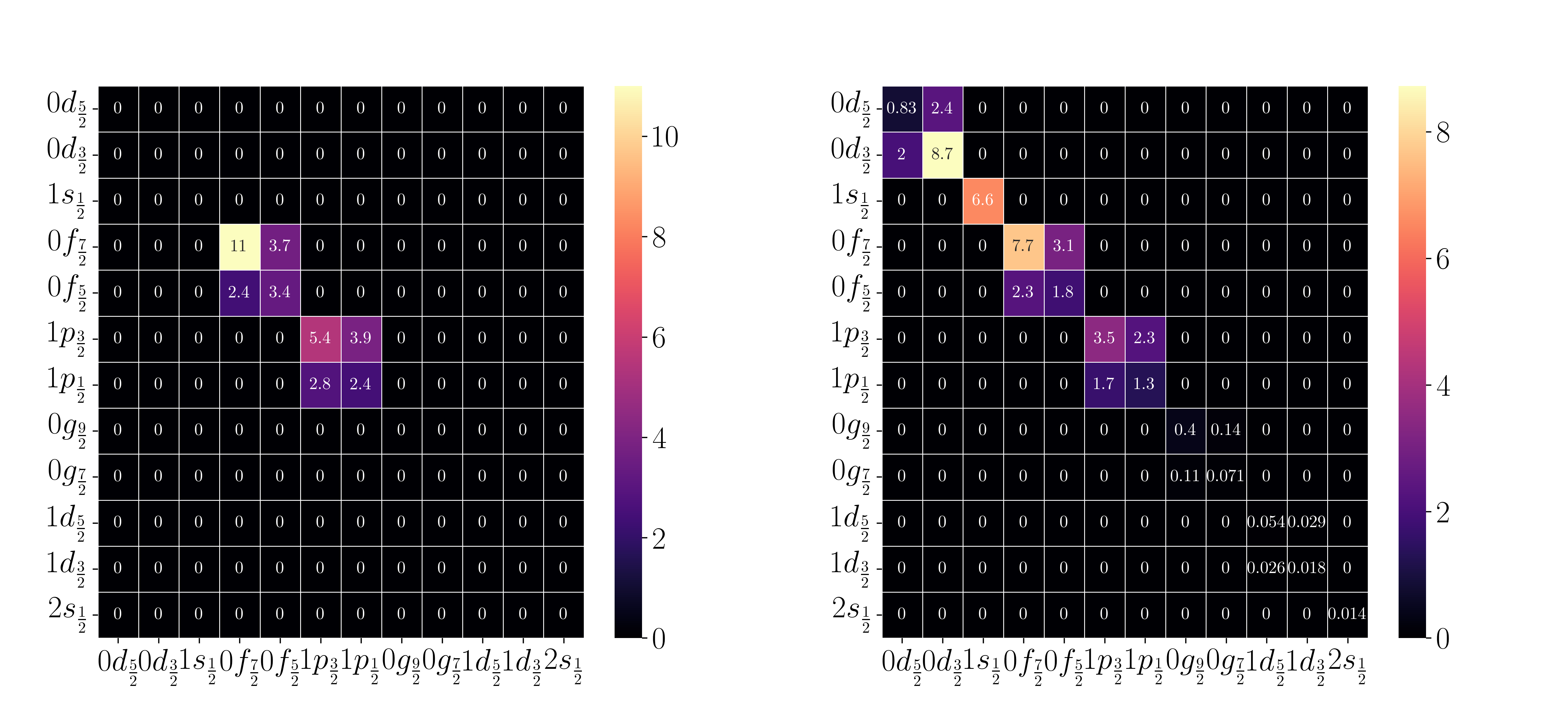 Let's start with the natural parity (left): The only non-zero OBTDs are within the $pf$ shell which agree with my expectations. First, the fermi surface for both protons and neutrons is in the $0f7/2$ orbital so we expect a lot of action inside the $pf$ shell. Second, since the $sd$ shell is completely full, and since protons and neutrons are fermions which means that permutations don't matter, the $sd$ shell is completely locked as long as there are no $\hbar \omega$ excitations (excitations across a major shell gap). If we allow an $\hbar \omega$ excitation from $sd$ to $pf$ then we change the parity to negative and hence it will not show up in the left 12×12 grid. If we excite two nucleons from $sd$ to $pf$ we will get back to the natural parity, but the calculations we are looking at are restricted to a $1 \hbar \omega$ truncation, meaning that only one nucleon can be excited across a major shell gap at any time. Consequently we should see OBTDs only in the $pf$ shell for the natural parity states.
