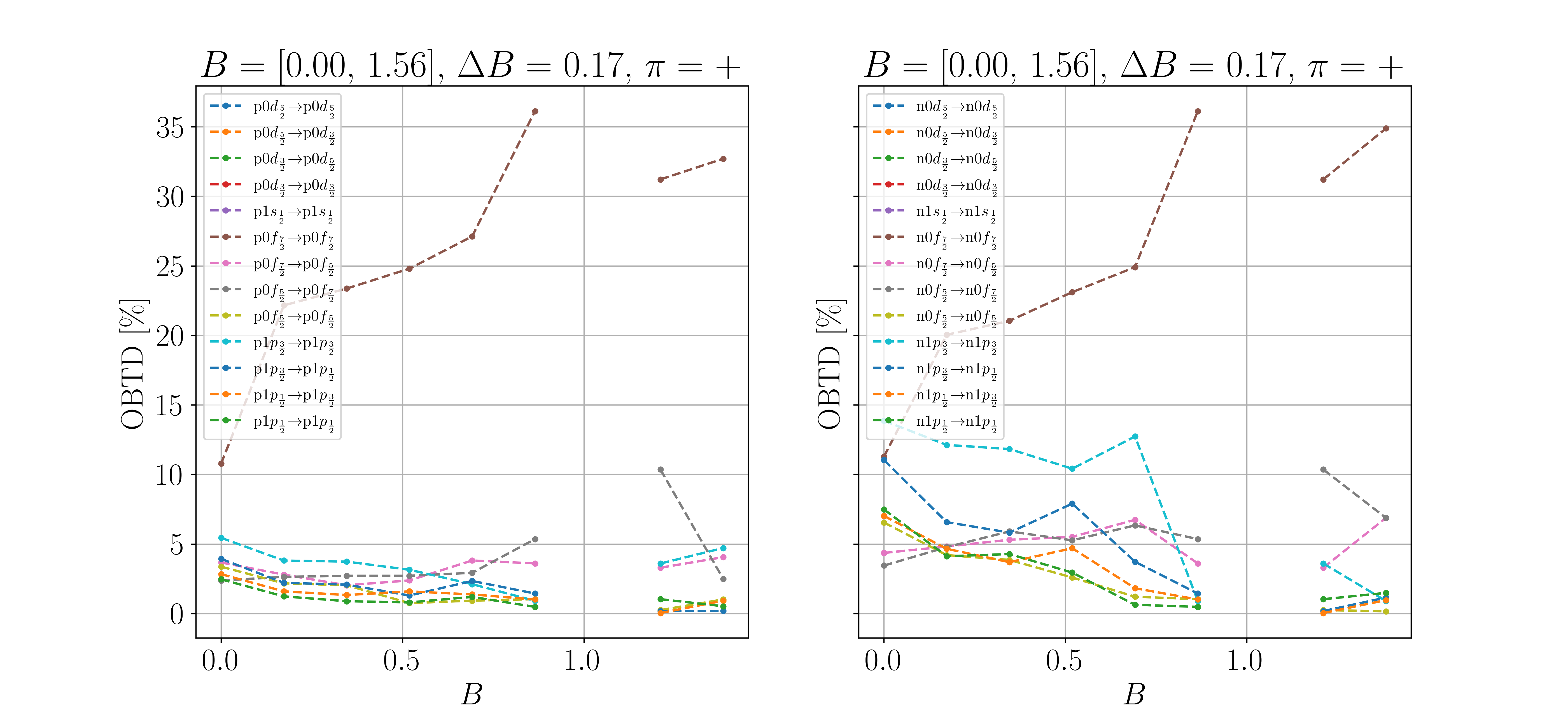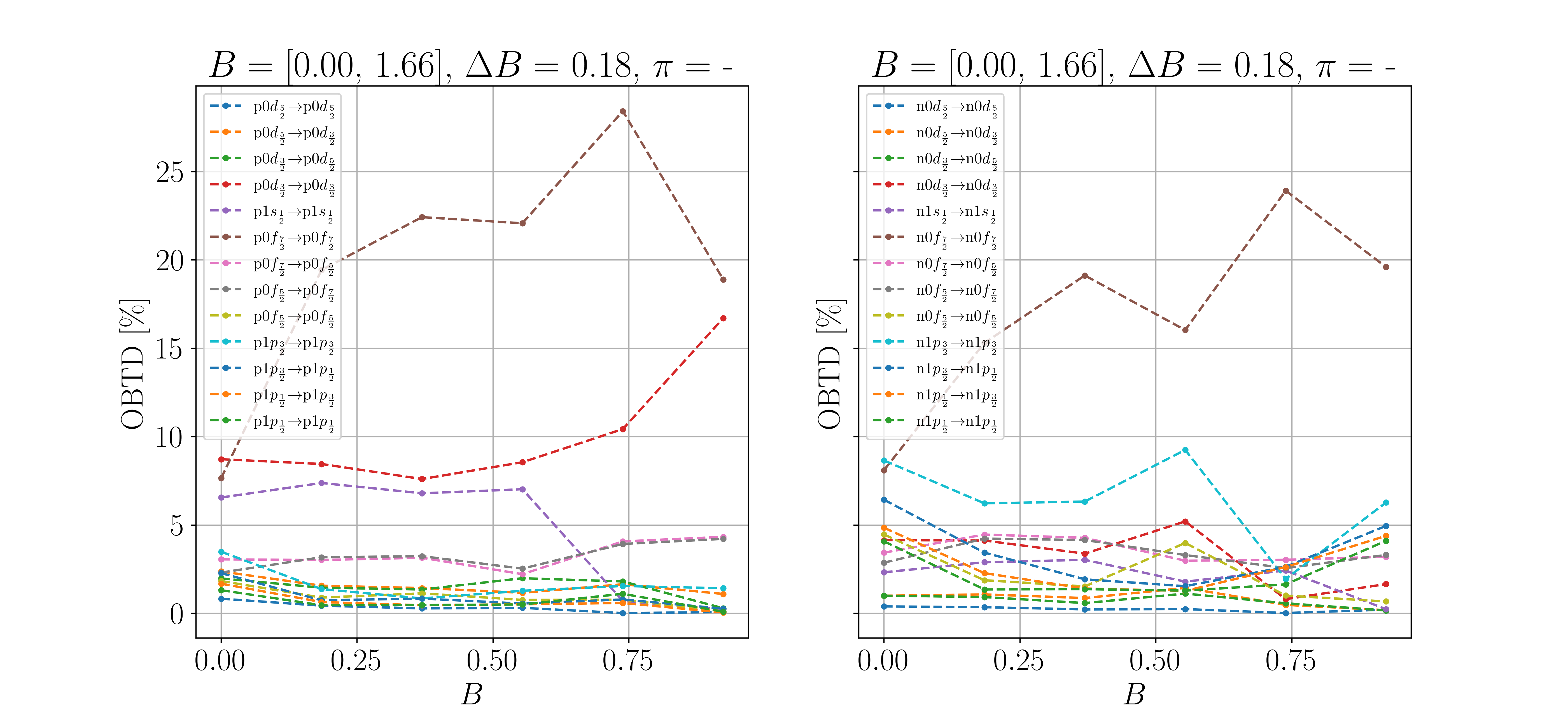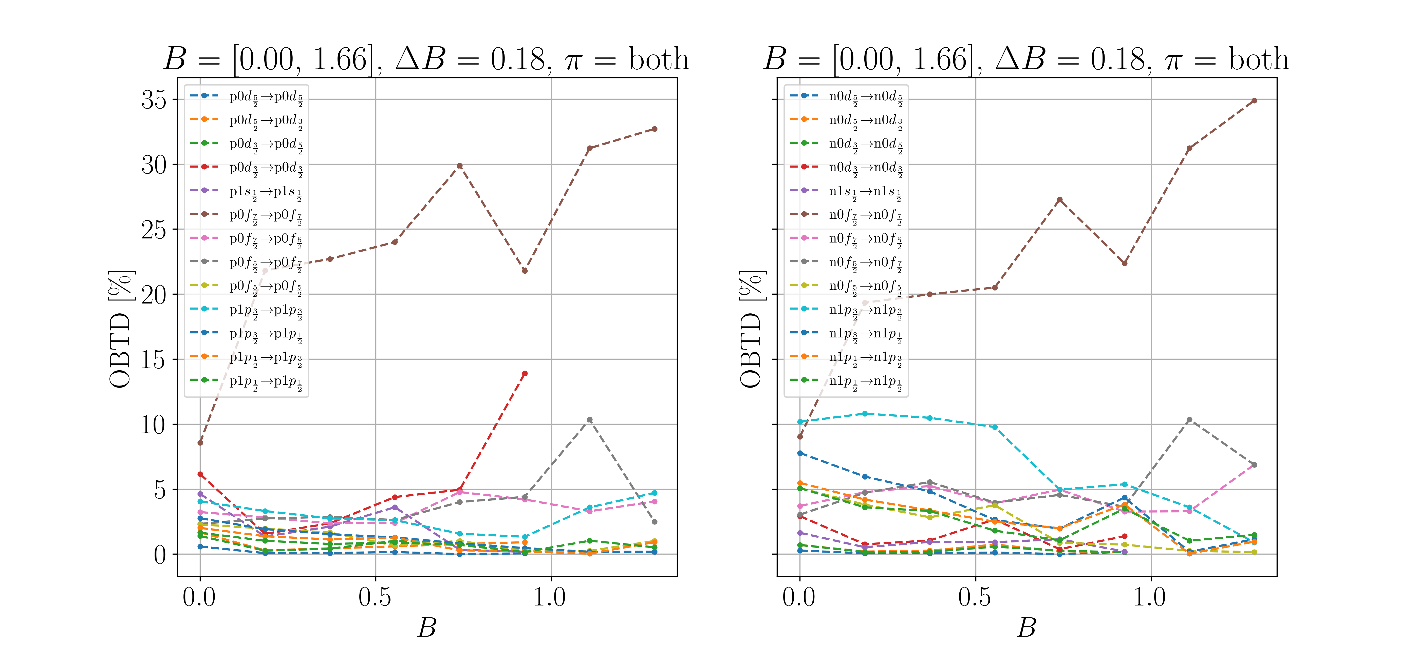 Well, it is apparent that $0f7/2 \rightarrow 0f7/2$ is the main contributor for both protons and neutrons. Seems also to follow the same trend for protons as for neutrons. At the mid-high $B$ values $p0d3/2 \rightarrow p0d3/2$ makes a valiant attempt at reaching $p0f7/2 \rightarrow p0f7/2$ but at higher $B$ values there is no more OBTD data for it. Judging by the continued increase of $0f7/2 \rightarrow 0f7/2$ I'd say that $p0d3/2 \rightarrow p0d3/2$ does not take over as the most dominant at the largest $B$ values.