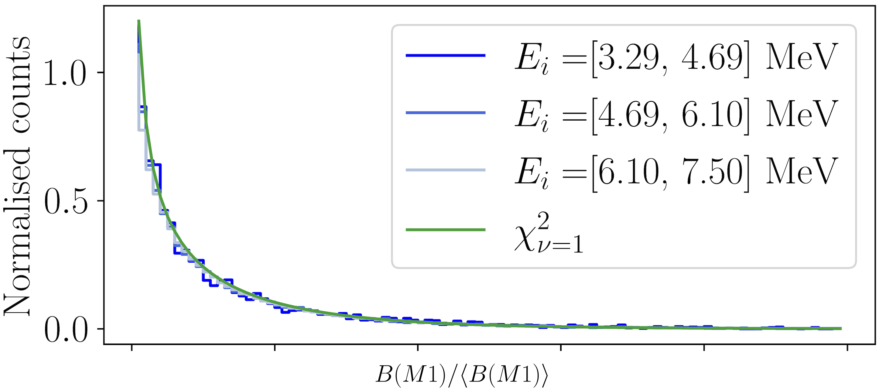 A central part of gamma decay theory and the GSF in particular is that the $B$ values follow the $\chi^2$ distribution with one degree of freedom. In this field the $\chi^2$ distribution is usually called the Porter-Thomas distribution. In the above figure, there are three $B$ distributions using transitions drawn from different $E_i$ (initial state's excitation energy) ranges, the reason for which is to show that the Porter-Thomas distribution emerges regardless of the detailed structure of the initial states. Closely related to the Brink-Axel hypothesis.